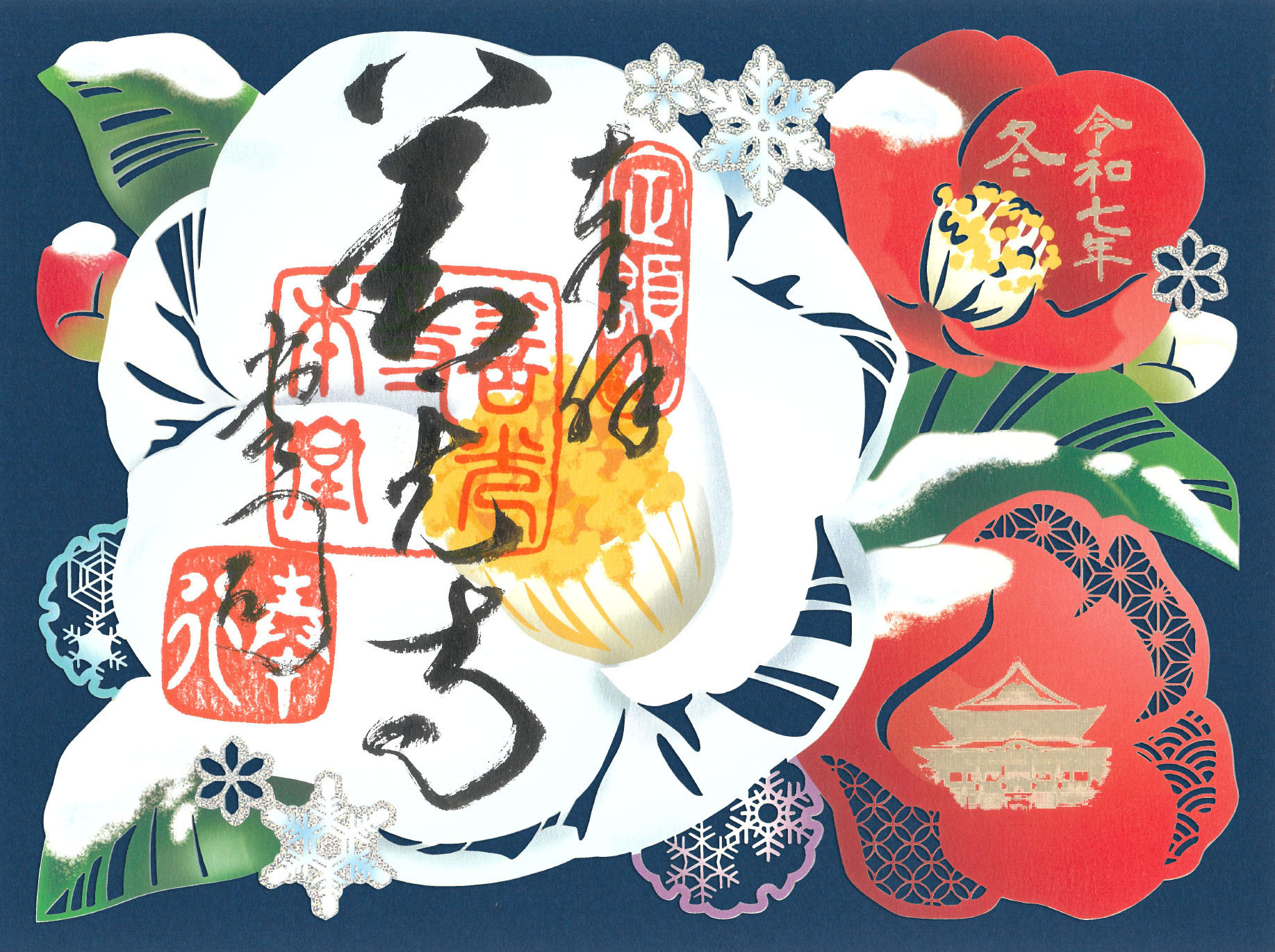 「本堂」をテーマにして、季節ごとにモチーフを変え、四季折々の花々を添えた切り絵御朱印です。色鮮やかな台紙で、さらに華やかさを表現しました。